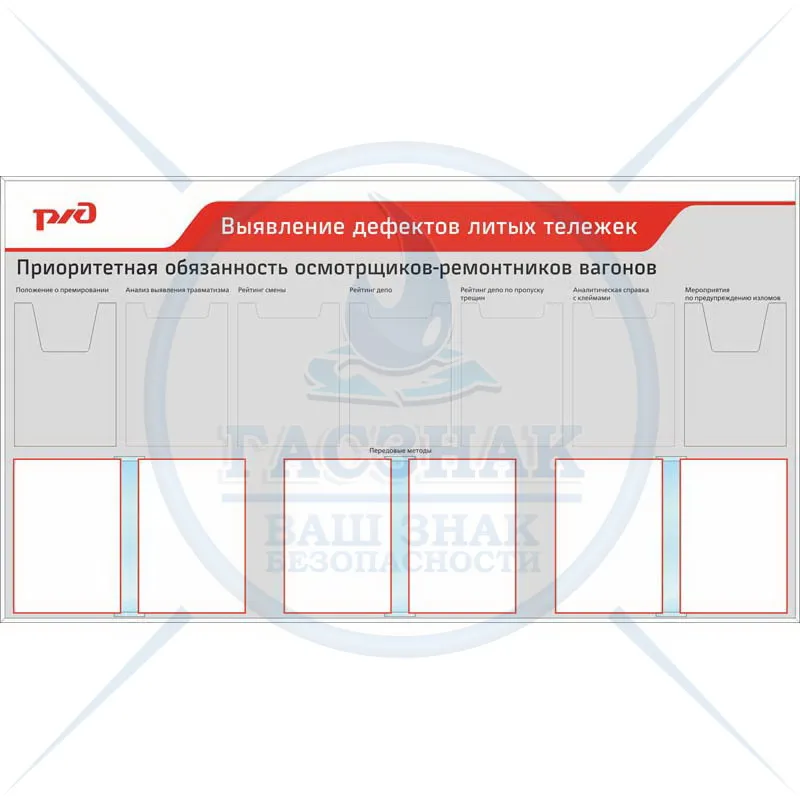 Стенд Уголок по технике безопасности РЖД, 1 карман А3 гор, 4 А4 объемн., 6 карманов А4 пл. (1650х1100; Пластик ПВХ 4 мм, алюминиевый профиль; )