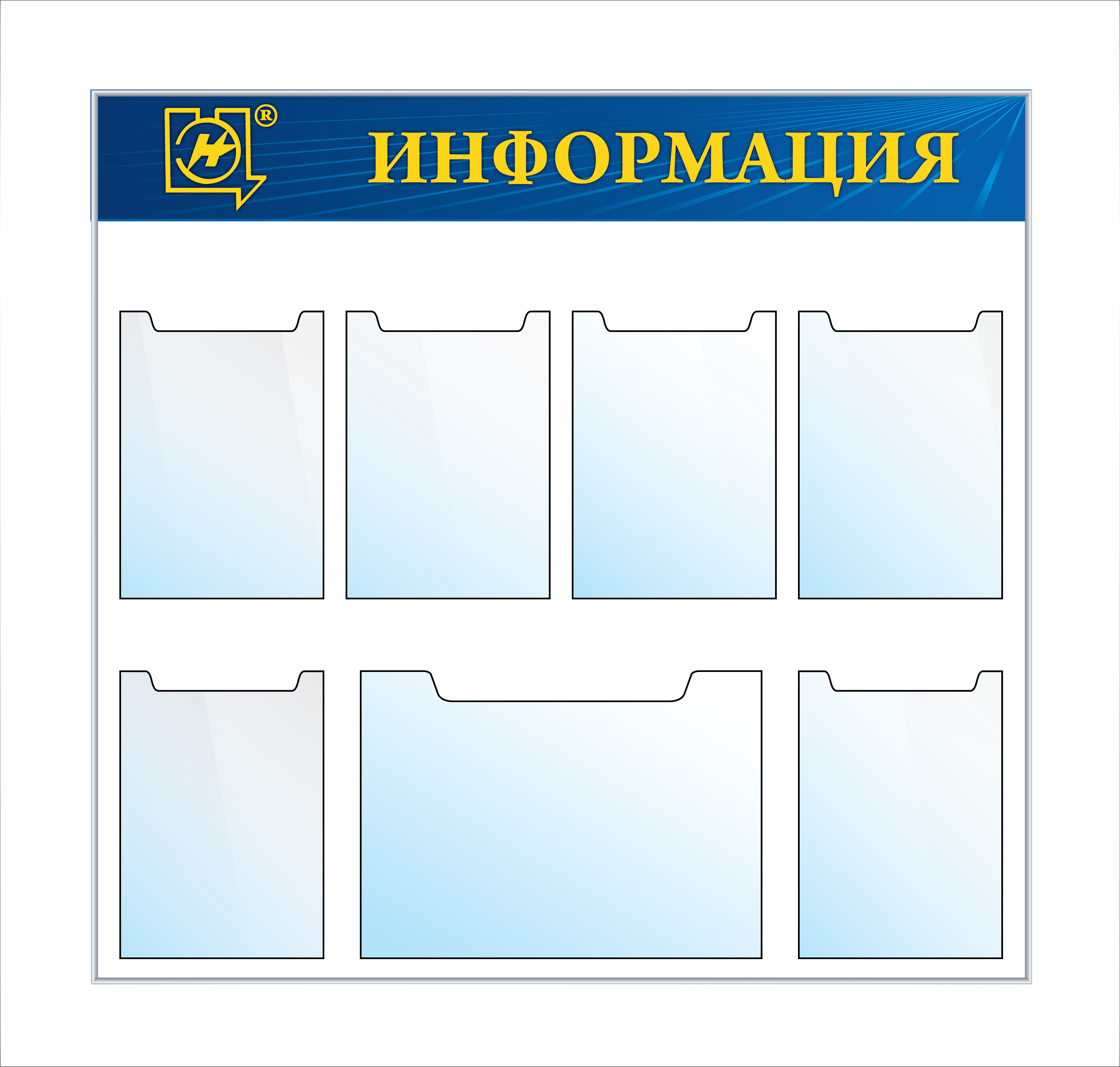 Стенд Информация карманы А4 -2шт (плоские), перекидное устройство А4 на 10 рамок, Логотип (600х900; Пластик ПВХ 4 мм; Пластиковый синий)