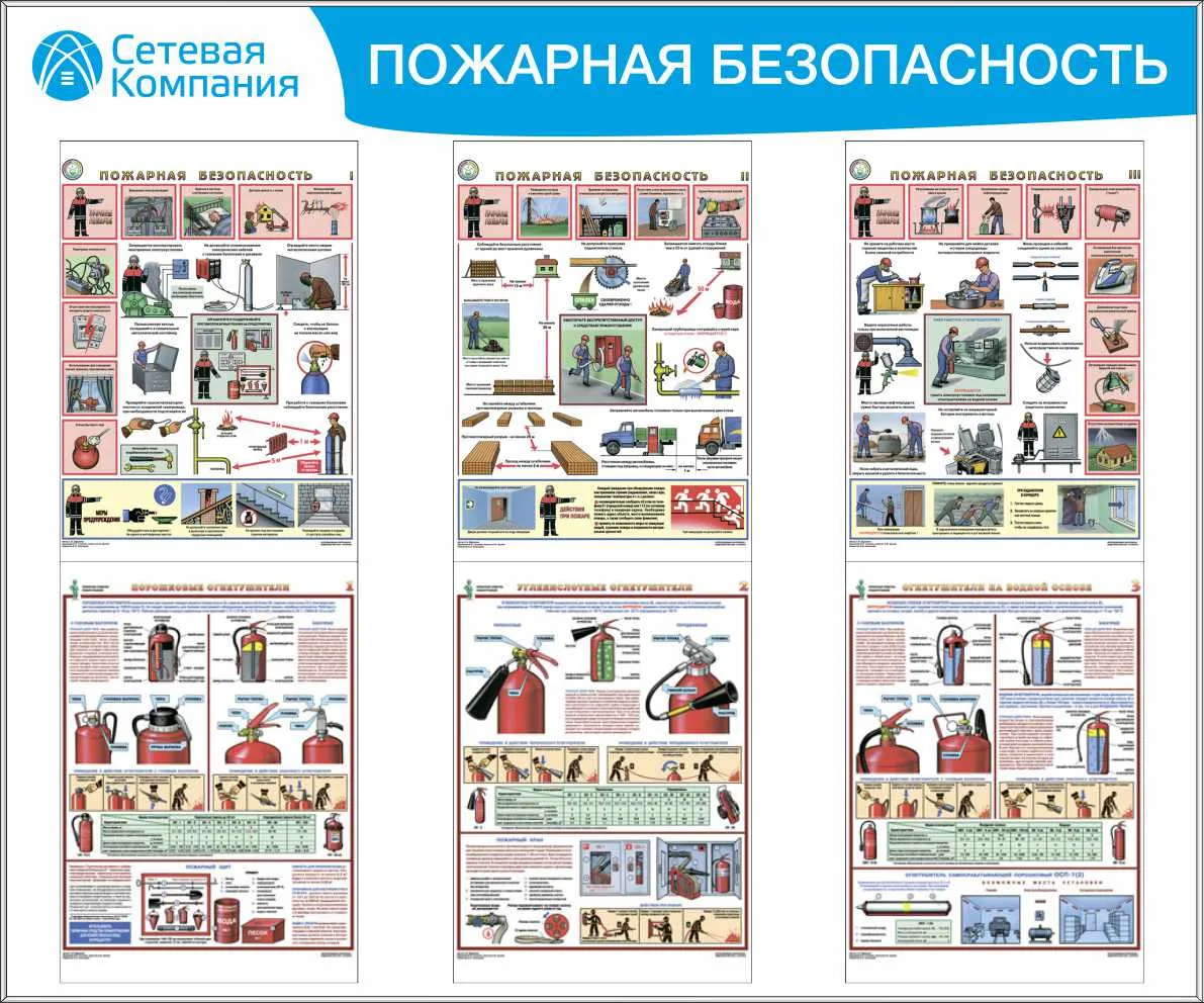Стенд для ОТ пожарная безопасность, 6 плакатов А3 (1 200х1 000; Пластик ПВХ 4 мм, Алюминиевый профиль)